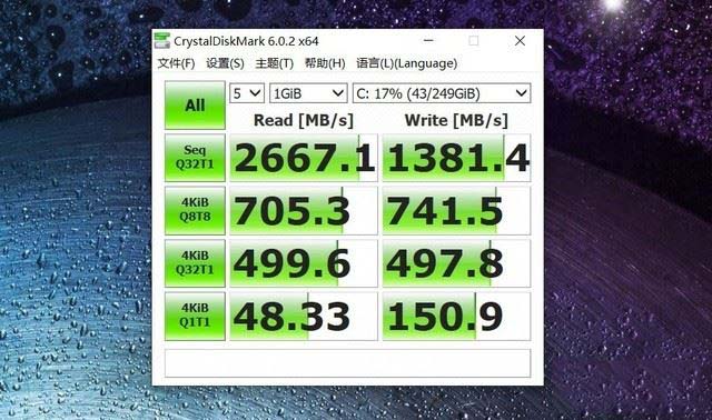 ENVY 13默認(rèn)把512GB硬盤劃分了兩個盤符,使用CrystalDiskMark測試可以看到這塊固態(tài)硬盤肯定是NVMe PCIe固態(tài)硬盤,性能處于目前的中高端水準(zhǔn),隊列深度為1的情況下,1GiB數(shù)據(jù)5次Seq Q32讀取速度為2666.1MB/s,寫入速度為1381.4MB/s。