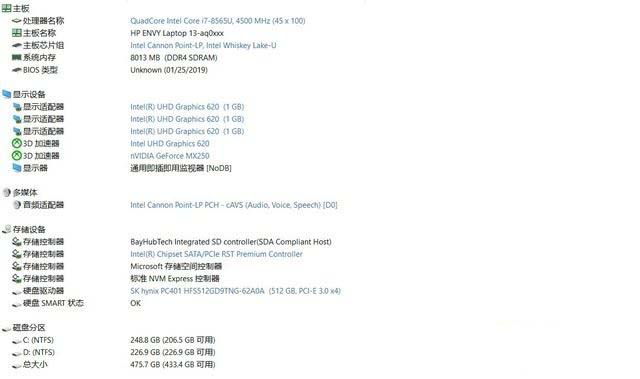 新ENVY 13系列配置比較多樣化,我的這臺采用了英特爾第八代酷睿i7 8565U處理器、8GB DDR4內(nèi)存、512GB SSD,以及NVIDIA GeForce MX 250獨(dú)顯。說實話目前英特爾處理器性能其實挺強(qiáng)了,酷睿i5和酷睿i7雖然跑分不一樣,但實際使用差別不是那么明顯,不過我還是覺得要買就買最高配,省得買了之后還要一直惦記。