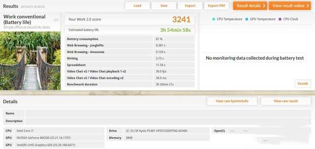續(xù)航方面我參考了PCMark 8 Work模式的測試成績,得益于53Wh大容量電池,其續(xù)航時間測試為3小時54分鐘之后,電量剩余19%,預(yù)估續(xù)航時間在4個半小時以上。