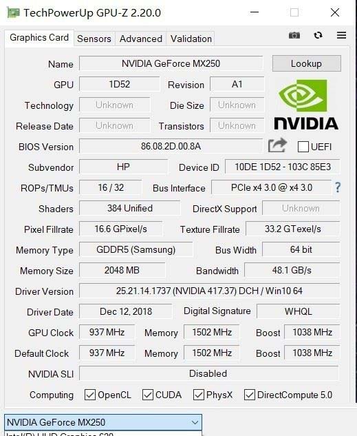 NVIDIA GeForce MX 250獨(dú)顯擁有384個流處理器、64bit顯存位寬、2GB GDDR5顯存,核心頻率937MHz,Boost頻率1038MHz,是目前移動端的入門級中的高端獨(dú)顯,能夠滿足基本的游戲娛樂需求,也很適合辦公用戶使用。