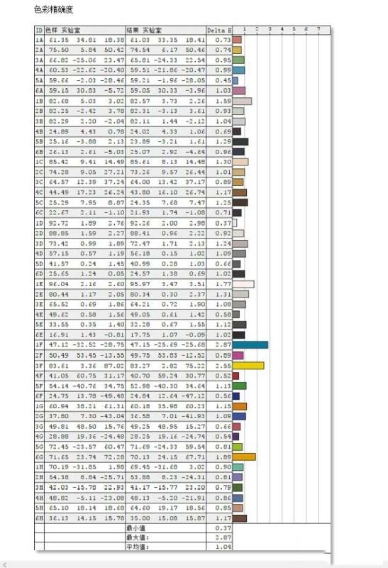 ENVY 13這塊屏幕的色彩精確度也較為不錯,ΔE最大值略有些高,為2.87,平均值略高,為1.04,大部分色彩ΔE值在1以下,屏幕整體的色彩還原還是很不錯的。
