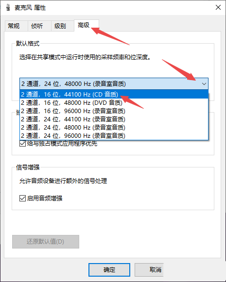 6、之后我們點(diǎn)擊高級,然后我們點(diǎn)擊圖示中的下拉箭頭,之后選擇CD音質(zhì);