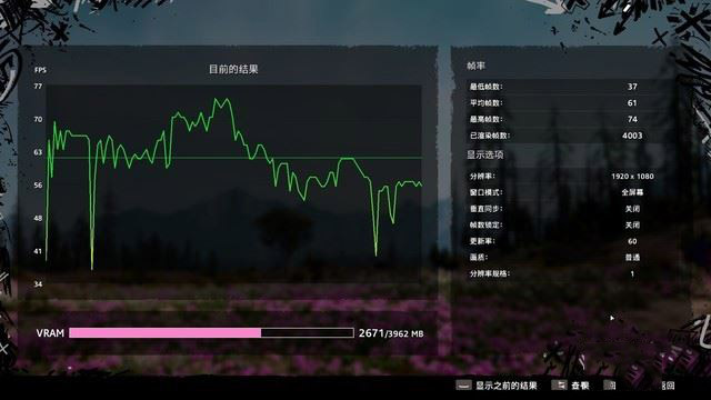 其次是《孤島驚魂:新曙光》。畫質(zhì)設(shè)置為:系統(tǒng)內(nèi)置的普通畫質(zhì)、1920×1080、關(guān)閉垂直同步。最終得到平均61幀的成績,其中最高為74幀。從最終幀數(shù)成績來看,戴爾G3可以流暢運行《孤島驚魂:新曙光》,游戲體驗出色。