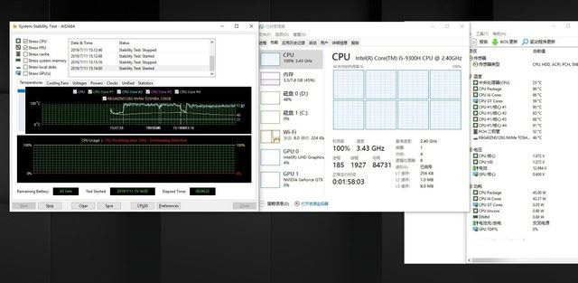 戴爾G3采用了雙風(fēng)扇雙熱管雙出風(fēng)口的散熱組合,在同價位產(chǎn)品中比較常見。我使用AIDA64系統(tǒng)穩(wěn)定性測試對CPU進行壓力測試,測試時長5分鐘。最終得到九代酷睿i5-9300H的最高溫度為96°,功耗維持在45W左右,頻率則穩(wěn)定在3.4GHz左右。從CPU單拷測試來看,戴爾G3的處理器性能釋放比較出色,可維持處理器45W的功率輸出。