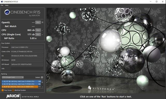 我使用Cinebench R15和R20對其進行測試。其中運行Cinebench R15得到多核成績865cb、單核成績171cb;運行Cinebench R20得到多核成績1996cb、單核成績412cb。從測試成績上看,九代酷睿i5-9300H的性能表現(xiàn)比較正常,符合其中端定位的身份。