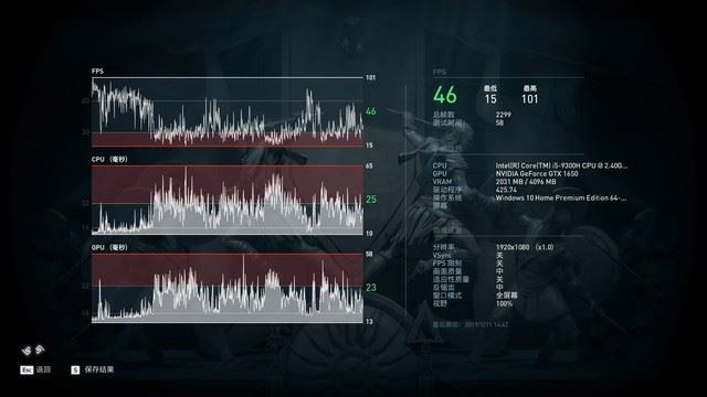 首先是《刺客信條:奧德賽》。畫質(zhì)設(shè)置為:系統(tǒng)內(nèi)置的中畫質(zhì),分辨率為1920×1080并關(guān)閉垂直同步。最終得到平均46幀的成績,其中最高達到了101幀。從最終幀數(shù)成績來看,戴爾G3可以運行《刺客信條:奧德賽》,流暢度屬于可接受水平。