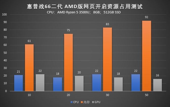 我們分別打開10個網頁,20個網頁,30個網頁,50個網頁,相信這對于日常操作已經是極限了,但是對于這款惠普戰66二代 AMD版筆記本來說,卻依然非常輕松,而且網頁的加載時間也都非常快,系統沒有出現卡頓或死機現象,除了內存在不斷增大之外,CPU和GPU都很穩,感覺信心滿滿。