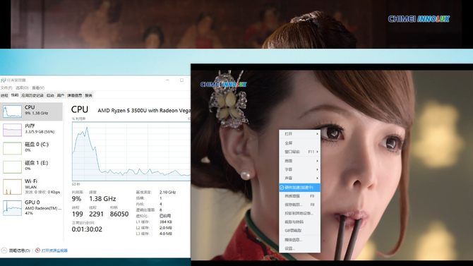 上面兩個圖什么意思呢?我們選取的是一個4K高清視頻,用于4K大屏電視機測試的。安裝迅雷影音播放,在正常情況下,可以流暢播放,但系統資源消耗很大,畫面偶爾會有丟幀卡頓現象。當開啟硬件加速后,系統資源占用大大減少,畫面也變得非常流暢,這就是其最明顯的變化,而且只有AMD平臺才有的優勢!