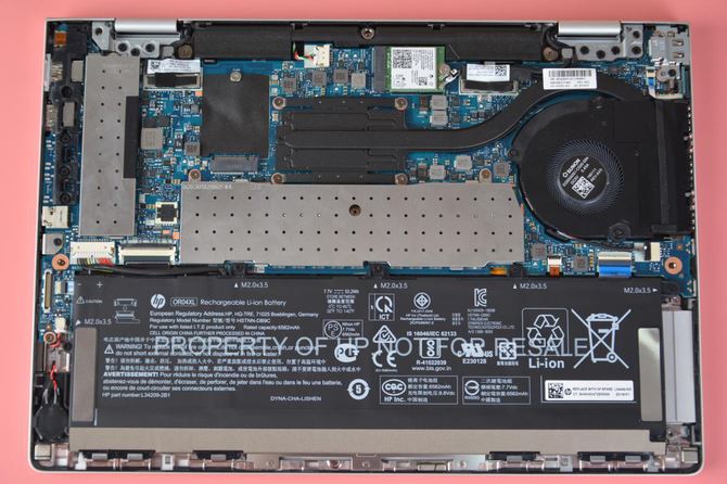 拆開后蓋,整機(jī)的內(nèi)部結(jié)構(gòu)映入眼簾,可以看到惠普戰(zhàn)X的做工還是非常不錯(cuò)的,繼承了以往戰(zhàn)系列產(chǎn)品的“軍規(guī)標(biāo)準(zhǔn)”。散熱模組采用了單熱管單風(fēng)扇設(shè)計(jì),符合主流輕薄本的水平。機(jī)身中部的內(nèi)存和左上方的固態(tài)硬盤都附上了金屬貼片,可有效保護(hù)pcb板、并進(jìn)一步加強(qiáng)散熱。