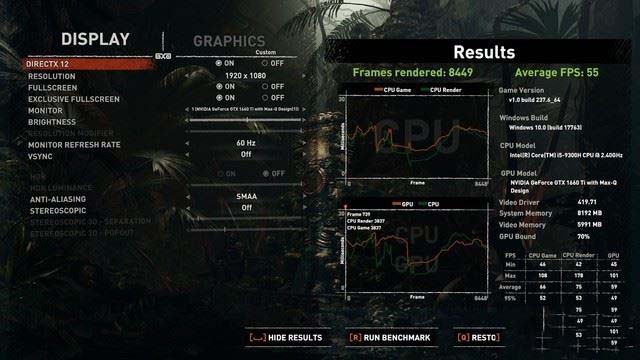 首先測(cè)試的是《古墓麗影:暗影》,我們將畫(huà)質(zhì)手動(dòng)調(diào)整至1080P最高特效SMAA抗鋸齒,在這樣的設(shè)置下惠普光影精靈5代的平均幀數(shù)可達(dá)55幀,實(shí)際畫(huà)面很流暢,如果玩家追求更高的幀數(shù)可以適當(dāng)調(diào)低畫(huà)質(zhì),GTX1660TiMax-Q的表現(xiàn)已經(jīng)很優(yōu)秀了。