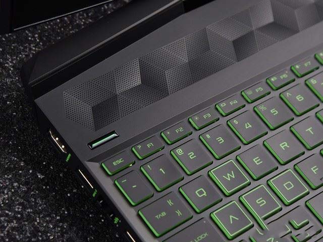 將鏡頭拉近,惠普光影精靈5代的電源鍵位于左上側(cè),同樣為紫色燈效。鍵盤(pán)上方區(qū)域采用了菱形揚(yáng)聲器格珊設(shè)計(jì),內(nèi)部搭載了B&O認(rèn)證跟調(diào)校的音效系統(tǒng),外放效果洪亮飽滿。