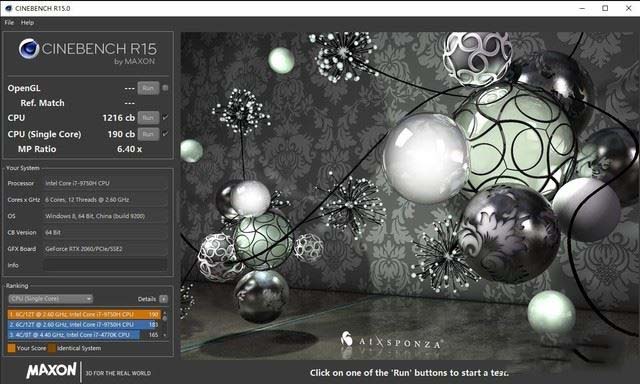 i7-9750H無需過多介紹,這款有著六核心十二線程規格的最新英特爾第九代酷睿處理器已經成為中高端游戲本的標配。Cinebench R15測試得到多核心1216cb、單核心190cb,Cinebench R20測試得到多核心2474cb、單核心449cb。對比搭載同款處理器的15.6英寸游戲本,暗影精靈5 Air的處理器性能釋放相當給力,基本達到了最佳性能釋放水平,特別是單核能力,傲視群雄。