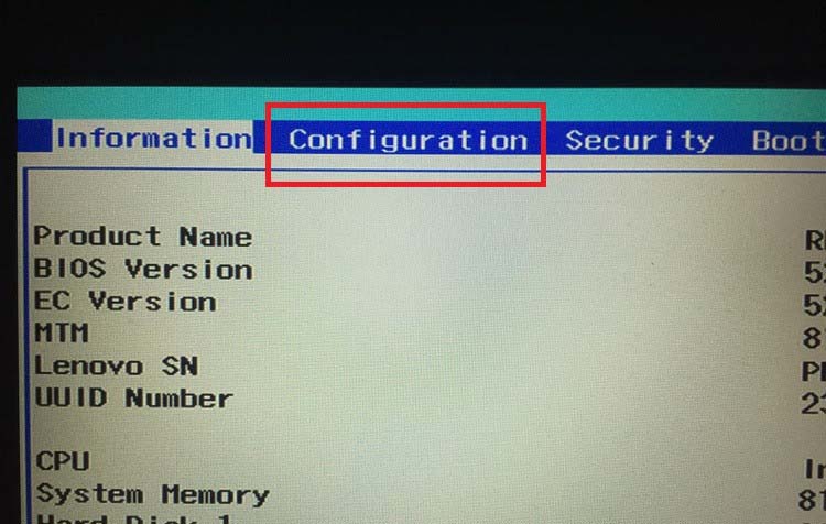 2、接著進入到bios的界面,選擇標題欄的configuration選項。