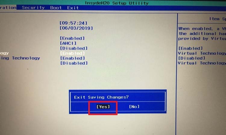 6、接著按鍵盤上的F10按鍵,在彈出的保存更改提示窗口界面選擇yes,這樣才能保存了剛才的設置,接著電腦就會自動重啟,這個時候就成功開啟了Intel 虛擬化技術功能。
