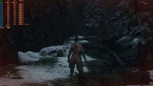 幀數曲線方面就比較有意思了,基本就是一條直線,偶爾會有59幀或61幀,就當為枯燥的直線增添些許歡樂。硬件占用方面,《只狼:影逝二度》的硬件要求實在是太低了,RTX2060平均負載只有75%,頻率則低到1035MHz左右,溫度也只有50°;i7-9750H的負載也很低,平均不超25%,功耗在15-30W之間浮動,不過頻率依舊穩定為3.98GHz,最高溫度64°。