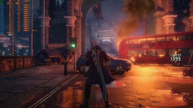 首先是幀數曲線,前三分之一曲線非常穩,幾乎沒有波動,后三分之二幀數有輕微浮動,整體幀數有所提升。幀數集中在130-170之間,平均幀數147幀,流暢度非常高。硬件占用方面,RTX2060負載97%左右,頻率維持在1410MHz左右,溫度最高71°;《鬼泣5》似乎并不依賴超線程技術,不過這對于玩家而言也不是壞事。i7-9750H的占用僅集中在六個核心上,平均占用率在40%以內,頻率比較穩定,仍舊為3.98GHz,功率在40-45W之間變化,最高溫度85°。《鬼泣5》的硬件占用屬于中等偏上水平。
