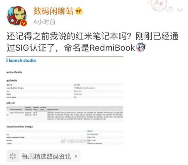 此前就有媒體曝光了紅米將進軍筆記本領域的消息,相信不少米粉都在期待了。今日知名數碼博主“數碼閑聊站”在微博發信息表示,紅米筆記本已經通過了SIG認證,命名是RedmiBook,看來紅米筆記本離我們也不遠了。