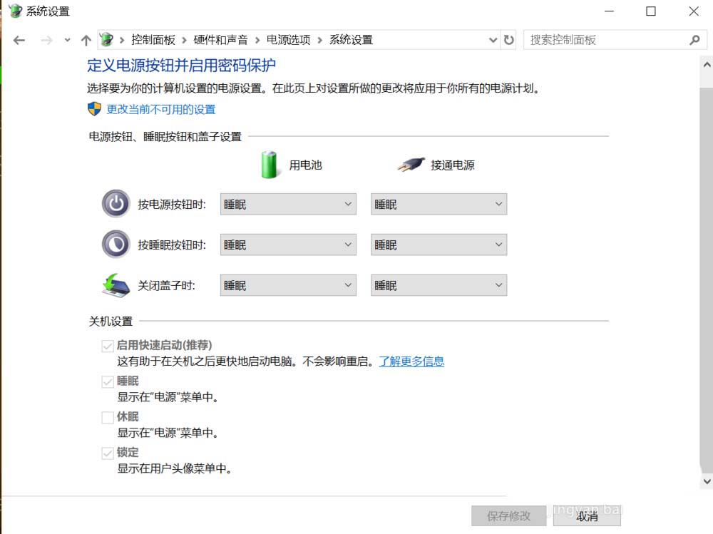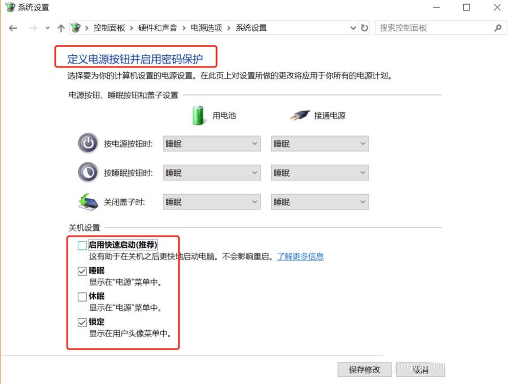 6、將【關機設置】的選項都關閉,以降低筆記本電腦在關機時的電池消耗。
