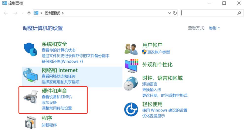 2、點擊打開【硬件和聲音】設置。