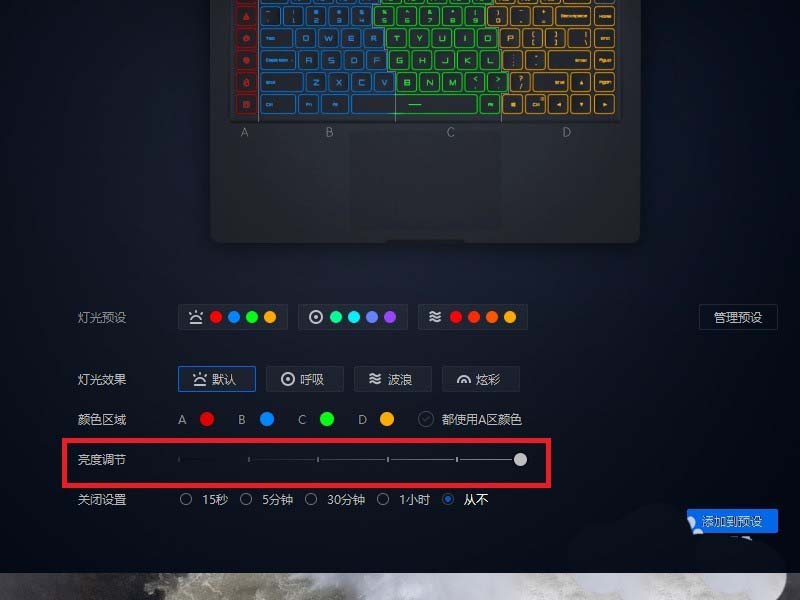 4、在打開的頁面中,可以看到亮度調節功能,直接拖動亮度調節滑塊,可以調整鍵盤燈的顯示亮度。