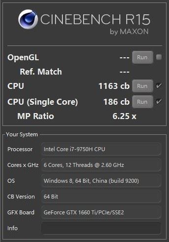 下面我們分別以Cinebench R15和3DMark為例來簡單分析一下處理器和顯卡的性能。在Cinebench R15中,惠普暗影精靈5上的這顆i7-9750H分別跑出了1163cb和186cb的成績,相比此前首測中的分數稍低,但也在正常值的范圍內。