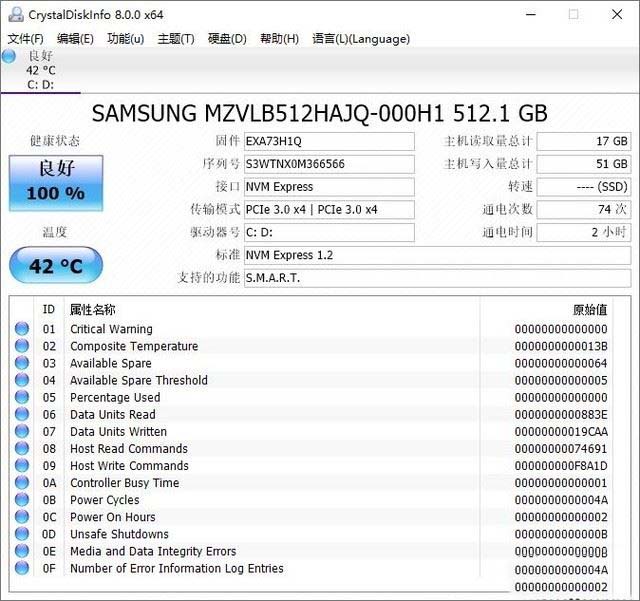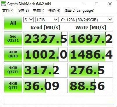 硬盤方面,暗影精靈5搭載了一塊512GB的固態硬盤,走PCIe 3.0×4通道,速率32Gb/s,型號為三星PM981,在CrystalDiskMark的測試中,這塊硬盤的順序讀寫分別是2328MB/s和1697MB/s,隨機讀寫分別是36MB/s和89MB/s。
