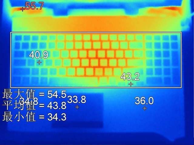 C面溫度方面,鍵盤區域最高54.5℃,最低34.3℃,平均43.8℃,WASD鍵和方向鍵區域都在平均溫度以下,觸控板、掌托位置更低一些,基本在35℃左右。C面除了鍵盤中間部分溫度稍高以外,其余部分的表現都還不錯。