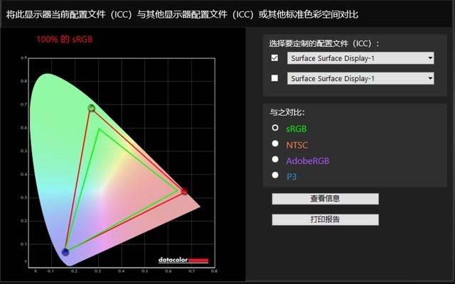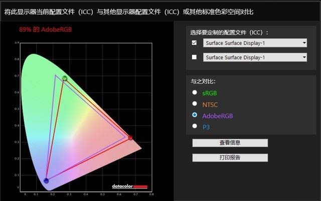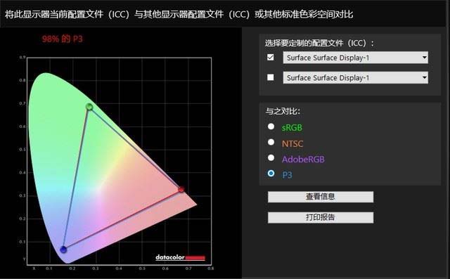 最后來看色域。Surface Studio 2這塊屏幕支持DCI-P3色域,專業視頻工作者對此一定不陌生。在Surface Studio 2之前,只有電影院和蘋果iMac才會用到DCI-P3色域,所以Surface Studio 2不僅僅能夠給專業設計師使用,也能夠成為影視后期工作的平臺。其DCI-P3色域達到98%,sRGB達100%,AdobeRGB高達89%,達到了專業顯示器水準。