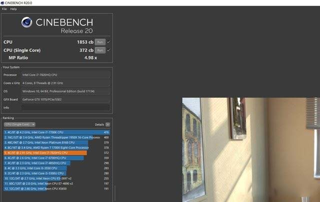 CINEBENCH R15測試結果:單核372cb 多核1853cb