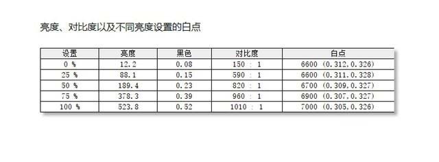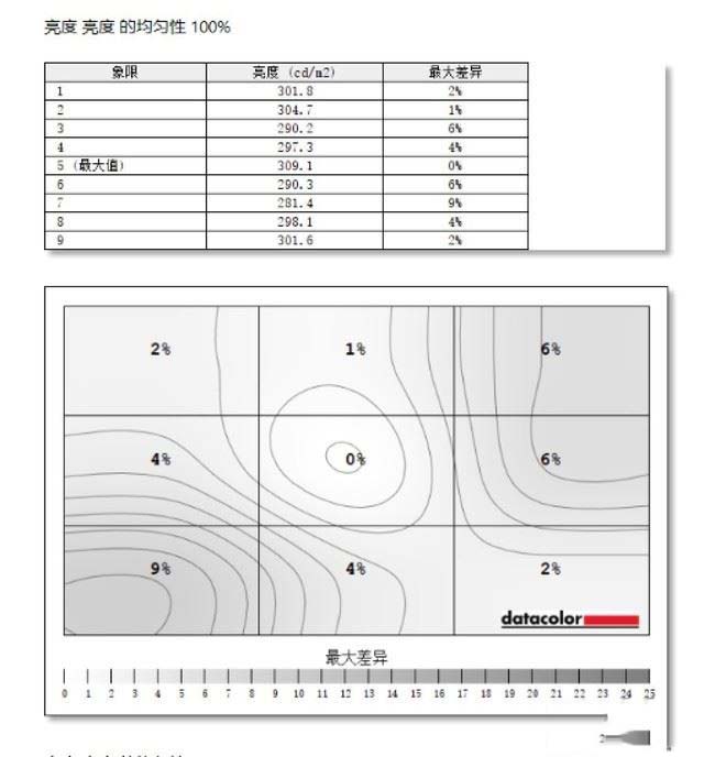 屏幕亮度均勻性上,100%亮度時,左下角均勻性相對差一些,但也只是在9%,整體偏差在6%以下,亮度非常均勻,達到了專業顯示器水準。