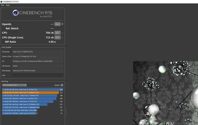 CINEBENCH R15測試結果:單核153cb 多核760cb