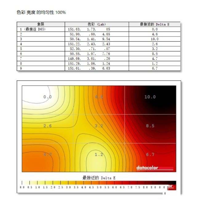 色彩亮度均勻性上,右上角表現最差,Delta E值為10,左上角表現最好,整體表現極佳。