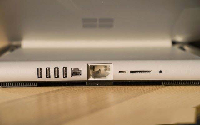 Surface Studio 2由三個部分組成,屏幕、支架和底座,主板等硬件均位于底座里,所以接口也自然而然的都分布在了這里。4個USB接口采用縱向設計,巧妙的規避了接口設計太近而相互影響使用的問題。另外還配有標準網口、電源口、USB TYPE-C接口、讀卡器和3.5mm耳麥插孔。