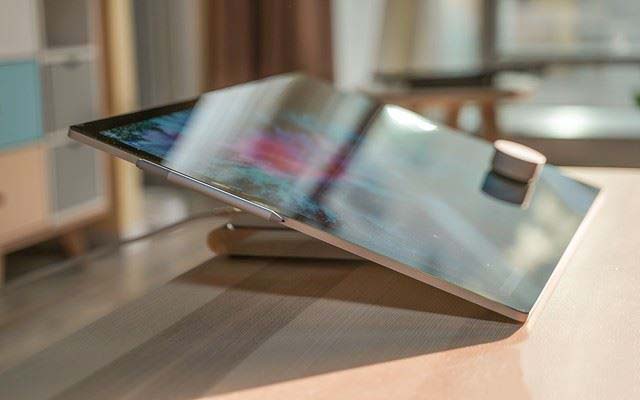 把Surface Studio 2的支架壓到最低,即與機身部分平行的狀態,然后“趴”在屏幕上作畫,這種姿勢相當的舒服,不信的話,有條件你可以去實體店里感受一下。這種使用方式看起來沒什么特別的,但卻是微軟獨家,而且我相信這個最終的角度一定是經過很多反饋而確定下來的。