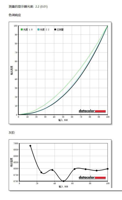 色調響應曲線堪稱完美,黑色已測量曲線與光度2.2曲線幾乎重合,灰階響應在6700K-6800K之間表現極其平穩。