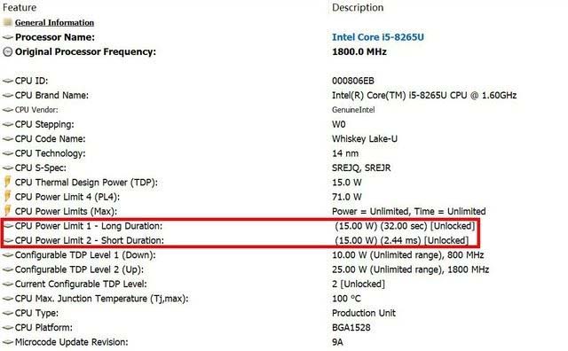 盡管筆記本搭載了最新的Whiskey Lake-U處理器,但是性能釋放比較保守,我們通過查看筆記本的PL1、PL2發現,處理器的長短時功耗都被限制在了15W,也就是i5-8265U的標準TDP。