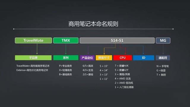 acer商務筆記本的名稱大致由四部分組成,分別是子品牌、系列、產品以及功能。TravelMate是子品牌,屬于高性能商務筆記本。