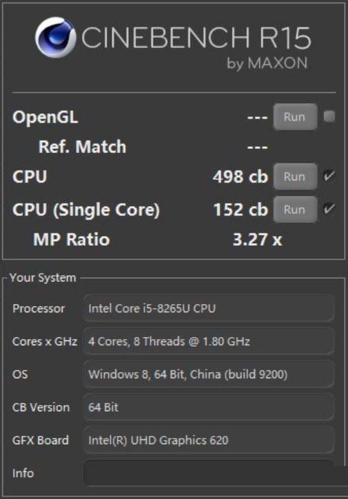 PL1、PL2被限制在15W對發掘處理器的性能是有一些影響的。我們通過Cinebench R15的跑分可以看出,i5-8265U的單核為152cb,多核為498cb,單核分數還好,多核分數遠沒有達到i5-8265U 600cb左右的平均水準。
