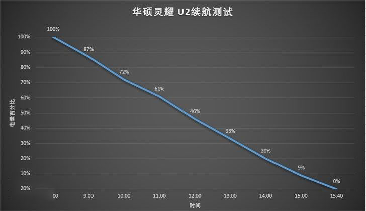 IT之家小編從早上8點開始用華碩靈耀Deluxe14筆記本在線播放B站上的紀錄片《宇宙》,畫質設置為1080P,屏幕亮度為100%,以上就是筆記本的耗電趨勢圖。經過7個小時40分鐘的連續播放后,華碩靈耀Deluxe14電量耗盡自動關機。按照45分鐘一集的電視劇來看的話,它可以連續播放10.2集。