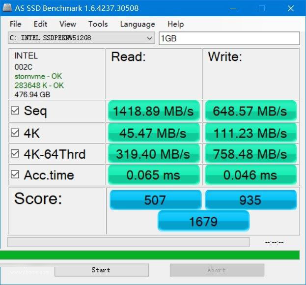 經過AS SSD軟件檢測可以發現,華碩靈耀2代搭載的SSD為英特爾SSDPEKNW 512GB,也就是660P。