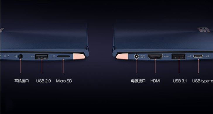 接口方面,靈耀Deluxe14左側依次是電源接口、HDMI接口、USB 3.1接口,USB Type-C接口,左側依次是Micro SD接口,USB 2.0接口和一個3.5mm耳機接口。