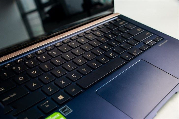 華碩靈耀Deluxe14的C面設計也很獨特,接近屏軸的一側是金色的金屬帶,上面有點狀散熱孔排布,可以增大屏軸的散熱面積,下面是鍵盤和一塊大小適中的觸摸板。華碩靈耀Deluxe14C面的元素很多,但是整體排布得很整齊,香檳金與深藍色搭配依舊很亮眼。另外,它的觸控板也可以選配特殊功能,可以把數字小鍵盤功能集成在觸控板上。