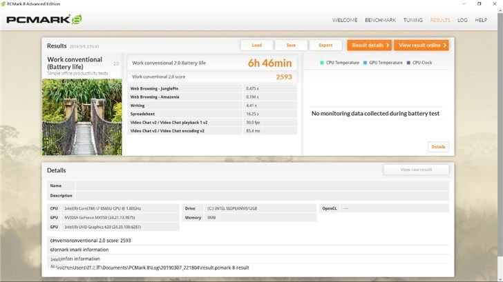 PC Mark 8的綜合續航測試包含了網頁瀏覽,文字處理,視頻聊天等多項功能,最后的綜合成績為6h46min,基本上可以做到一天的正常使用需要。