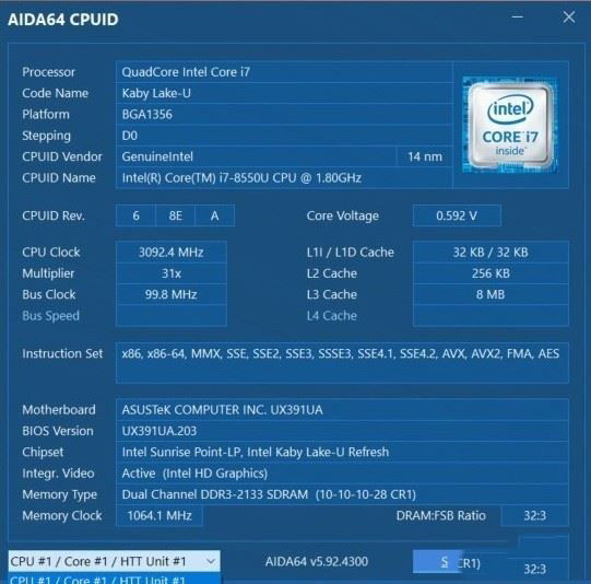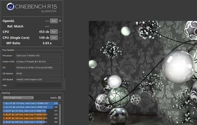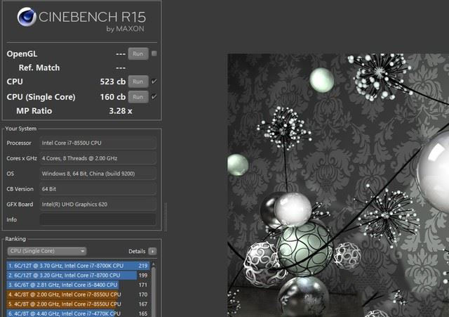 英特爾酷睿i78550U處理器基于14nm制程工藝,采用四核八線程設計,初始主頻為1.8GHz,可睿頻至4.0GHz,共享三級緩存為8MB,整體TDP(熱設計功耗)為15W。通過CINEBENCH R15測試可知,其單核性能為160cb,多核性能為523cb。