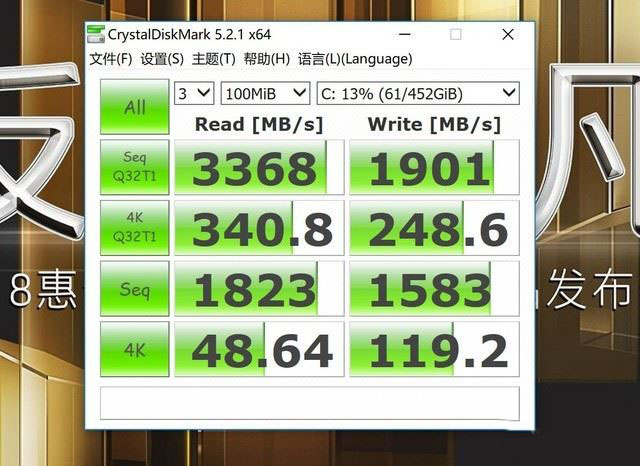 通過軟件實測可以看到,這塊固態(tài)硬盤Seq讀取速度高達3368MB/s,寫入速度也達到1901MB/s,整體性能表現(xiàn)十分出色。