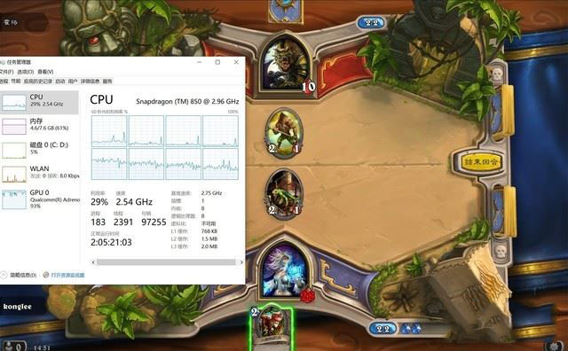 其次是游戲體驗,我選擇了卡牌游戲《爐石傳說》。游戲過程中處理器占用相對較低,平均30%,同樣為四個核心占用中等,四個核心占用較低;顯卡占用則明顯較高,達到了90%。游戲過程中我并沒有感覺到卡頓,可以看出HUAWEI MateBook E的性能還是挺不錯的。
