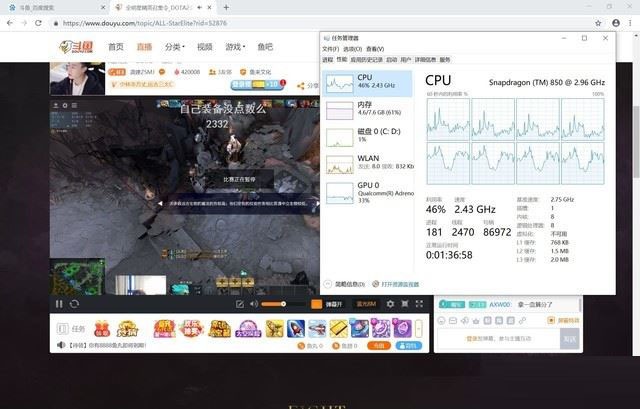 首先是視頻直播,我選擇了斗魚平臺,直播畫質選擇藍光8M,此時處理器占用大約在40%左右,八個核心中有四個核心占用中等,四個核心占用較少;顯卡占用只有33%,看來圖形壓力對于顯卡而言比較小。從結果來看,HUAWEI MateBook E可以輕松應對視頻直播。