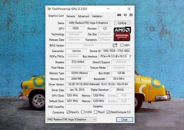 AMD在圖形方面一直以來有著較為明顯的優(yōu)勢,Radeon Vega 8集顯擁有512個著色單元,128bit顯存位寬,1201MHz核心頻率。不過出乎意料的是居然檢測出了2GB顯存,這與APU的特性不太符合