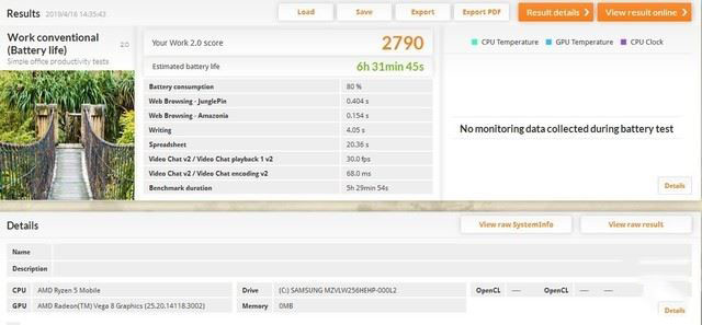 續(xù)航能力也是輕薄本比較重要的參數(shù),對于用戶來說,AMD平臺的續(xù)航能力可能還不太了解。我使用PCMark 8的Work模式,在75%亮度、平衡性能模式下對其進行了測試,最終時間為6小時31分鐘,基本可以滿足一天的使用需求。這也側(cè)面反映出,新一代銳龍3000系列 處理器在換裝12nm制程后,其低能耗的特性對電腦續(xù)航能力提升有了很大的幫助。我們的測試經(jīng)驗看,PCMark8續(xù)航測試能夠超過6小時的機器鳳毛麟角。特別是售價不足4000元的產(chǎn)品,大多采用30-40Whr的電池,小新14銳龍版的52.5Whr電池也對出色的續(xù)航能力功不可沒。