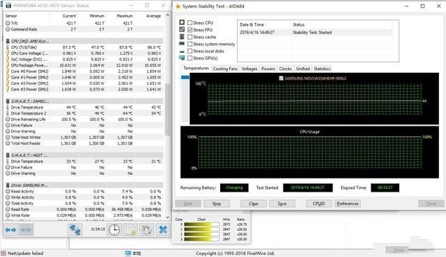 在基本的散熱設(shè)計上,小新14采用了底部進風(fēng)、屏軸部分出風(fēng)的設(shè)計,接下來通過AIDA 64我們來看看其核心溫度情況。我使用AIDA 64的FPU拷機對其進行了測試,經(jīng)過一段時間之后,可以看到處理器核心溫度平均為86℃,相對來說表現(xiàn)較好。